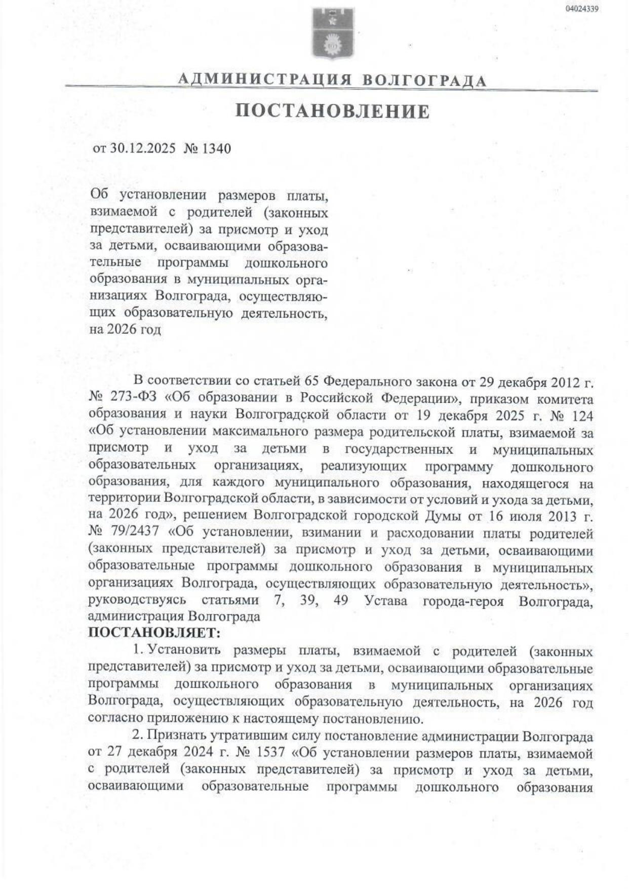 Постановление администрации Волгограда №1340 от 30.12.2025 г.